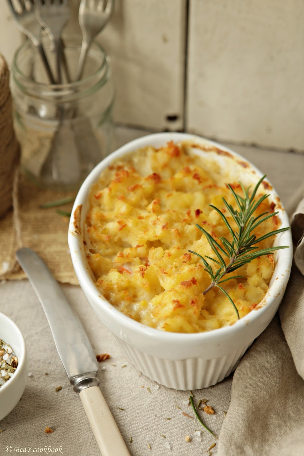 7.Now the magic starts :) Pour the creamy sauce into a oven dish, cover with mash potatoes and cook in the oven for 45 minutes.